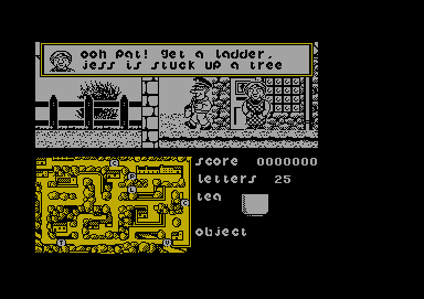 Postman Pat, cambiamos ligeramente la perspectiva, por la de un comic en blanco y negro, al estilo de las clásicas tiras de los periódicos. Al igual que en la primera parte, debemos ir haciendo misiones y entregas de cartas, pero ya no llevaremos nuestra preciosa furgoneta, sino que deberemos hacer las entregas a pie, lo que en ocasiones se volverá un largo camino, especialmente en los recorridos horizontales. Al igual que en la primera parte, hay un mapa, pero en esta ocasión nos viene ya hecho. Hay una zona bien delimitada donde están las casas, y otros lugares donde hay lugareños a los que habrá que ayudar (uno te pedirá una lintera (torch), otro te pedirá una bomba de aire (pump), otro un patinete, una señora te pedirá una escalera para bajar a su gato del árbol (ladder) y así). Cada vez que realicemos bien una misión, nos darán té, que es lo que sustenta a nuestro querido Pat (algo así como las espinacas de Popeye). Durante nuestro trayecto debemos entregar también 25 cartas, en un orden concreto. El orden se nos indica en el mapa. La siguiente carta se nos indica con una L (Letter). También, veremos por el camino una serie de pollos histéricos cuya única ilusión en la vida es quitarnos la saca y dejarla por ahí tirada. Luego pasaremos un buen rato buscando la saca, así que mejor ni acercarse a los pollos. En el mapa se ven con la letra C (Cock). Por otro lado, para no perder tanto tiempo en los desplazamientos, nuestro buen amigo tiene una furgoneta que nos permite llegar al siguiente lugar de entrega de la carta rápidamente. Para ello hay que buscar su furgoneta en el mapa con la letra v (van). Por último, la bomba de aire está rota, así que debemos arreglarla antes de entregarla. Otro de nuestros amigos nos arreglará aquello que precise reparación.